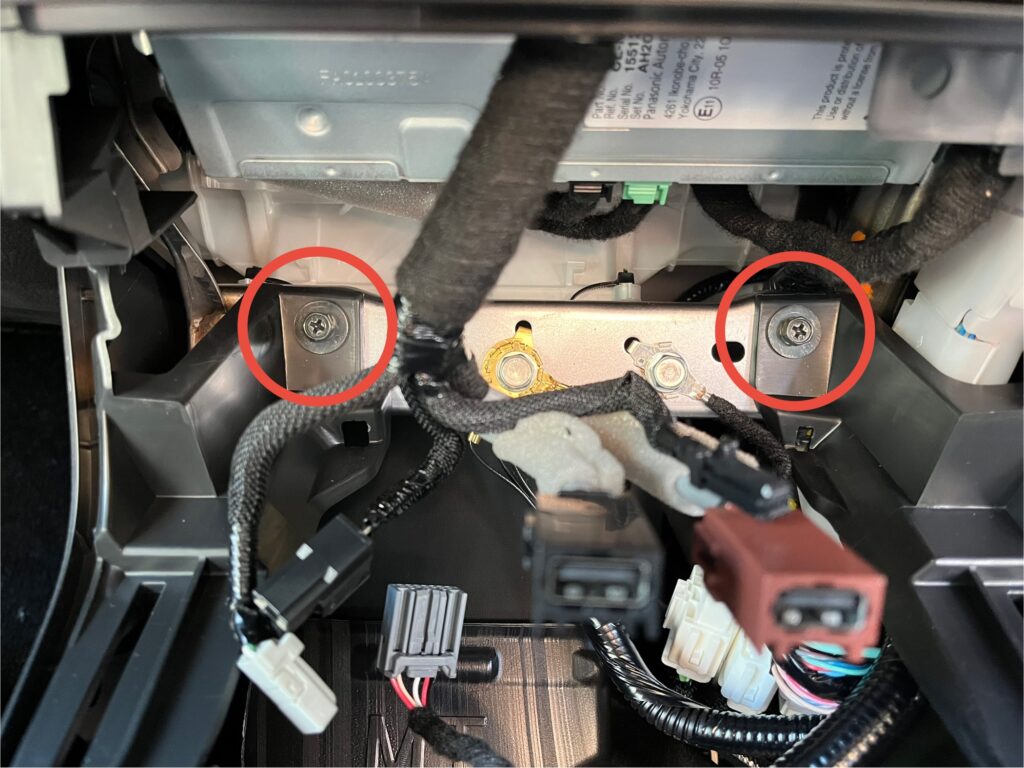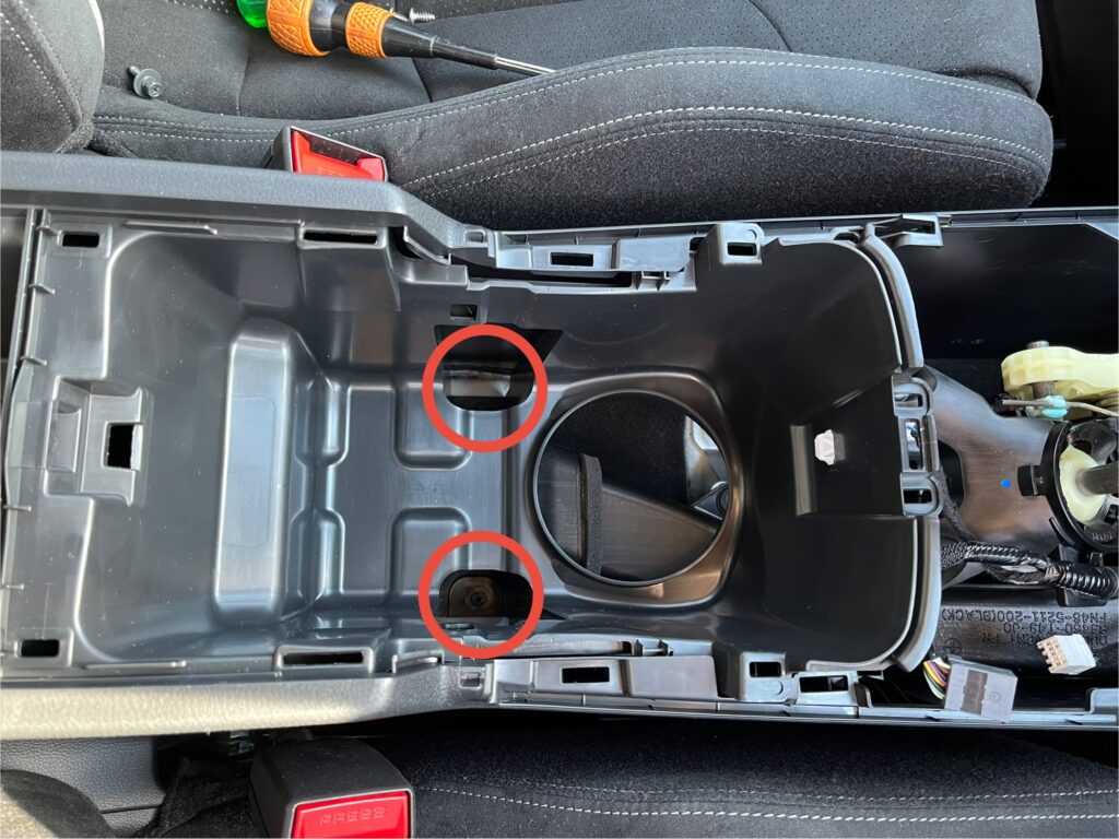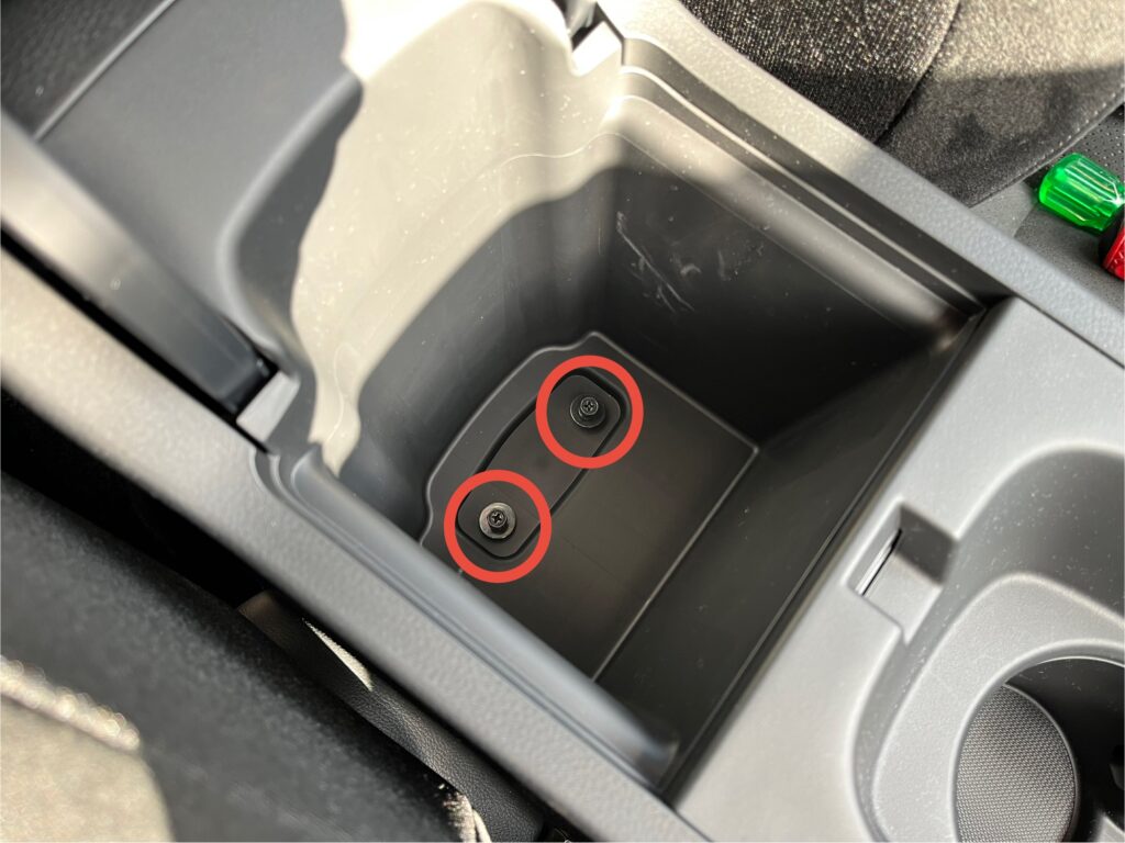 センターコンソール固定しているネジ類は6本。下写真3枚の赤丸を参照。