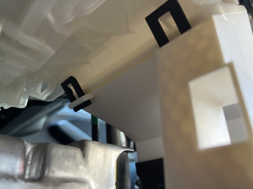 車体に付けるとこんな感じ。純正の分岐ダクトは4箇所のツメで固定されているが、ツメ形状を3Dプリンターで再現してみたら簡単に折れた… 3Dプリンターのパラメータをイジって強度を高めたいところだが、時間的猶予がなかったため、フック形状の造形にして結束バンド留めに変更。
