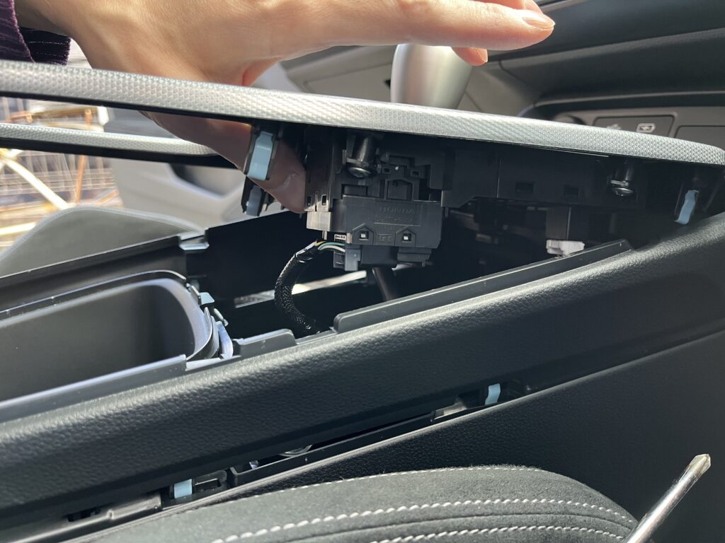 はじめに電動パーキングブレーキのスイッチが付いている灰色のパネルを一旦外し、スイッチのコネクタを外した。
